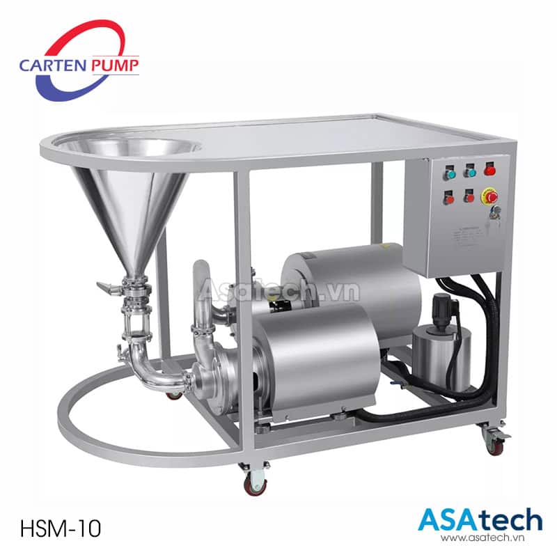 Hệ thống đồng hóa Carten Pump HSM-10 là hệ thống kết hợp giữa 2 dòng bơm CIP tự mồi Carten Pump và bơm cánh khế Carten Pump công suất 4.0 kw, dùng để phân tán và đồng hóa các loại chất đặc sệt độ nhớt lên đến 5000cps thành 1 chất đồng nhất.